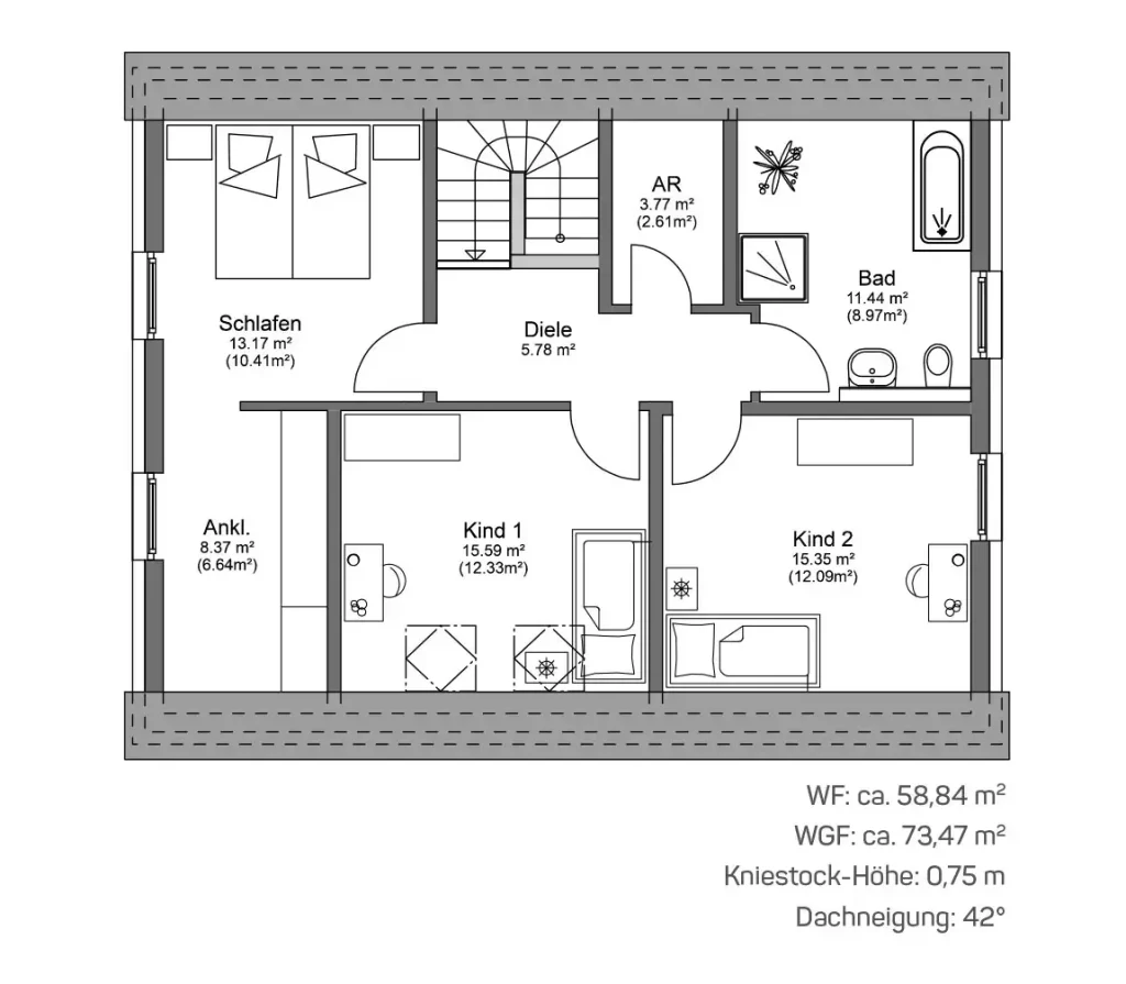 Für alle, die ein geräumiges Massivhaus schlüsselfertig bauen möchten, eignet sich bestens SIMPLY L. Die Grundrisse der SIMPLY HOME Massivhäuser wurden vom Profi bereits fertig geplant. Trotzdem ist es möglich, den gesamten Grundriss auch in gespiegelter Ausführung zu wählen, damit Ihr Traumhaus perfekt zu Ihrem Grundstück passt. Durch die bereits feststehende intelligente Grundrissgestaltung können Sie sich entspannt zurücklehnen und so wertvolle Zeit und Geld sparen.